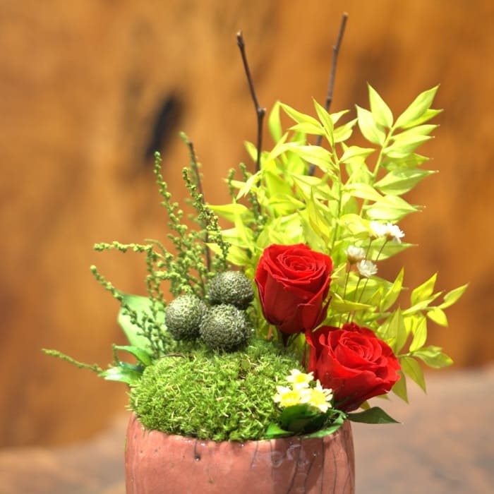 みずみずしいグリーンと苔の柔らかな質感を合わせた大人なアレンジメントです。