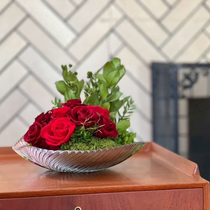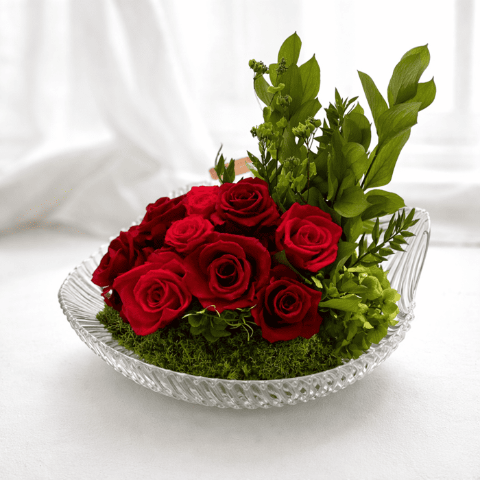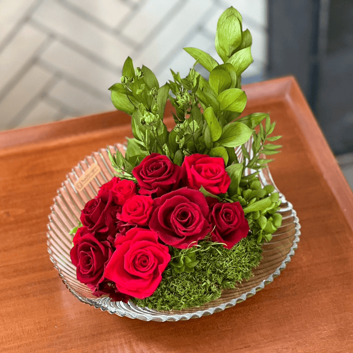 流れるような曲線が美しいガラスベースが、空間に静かな上質感と洗練をもたらします。