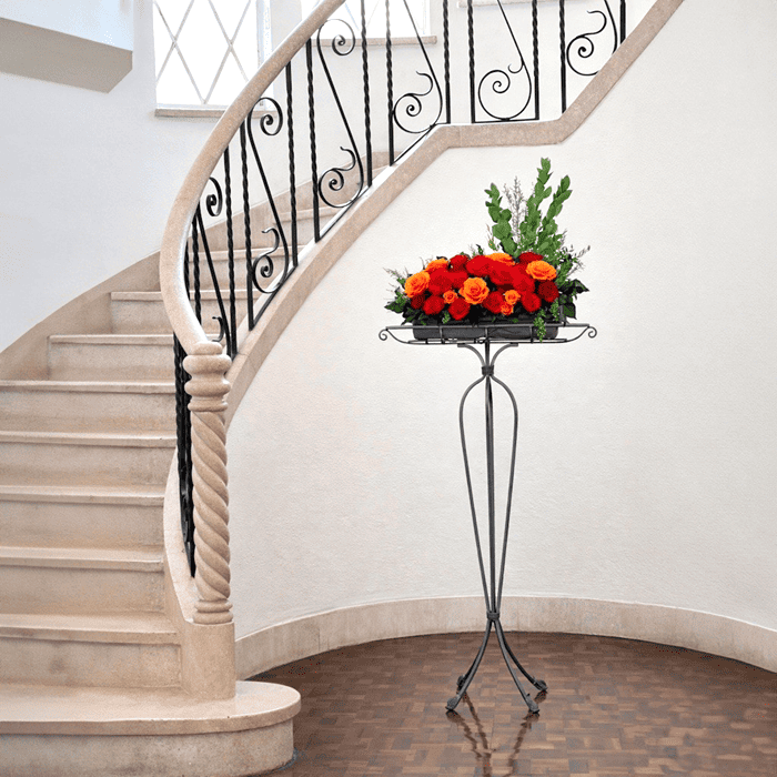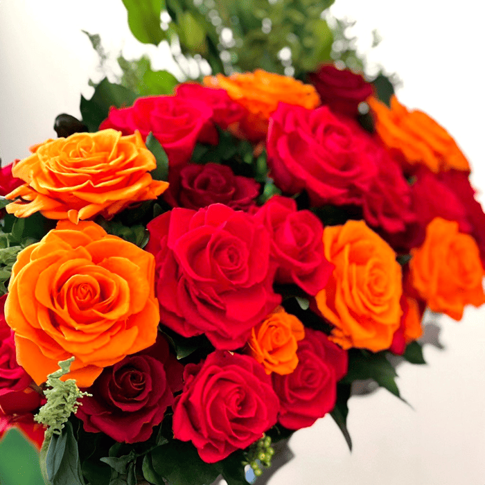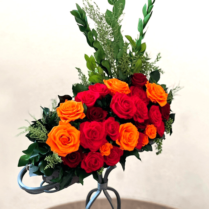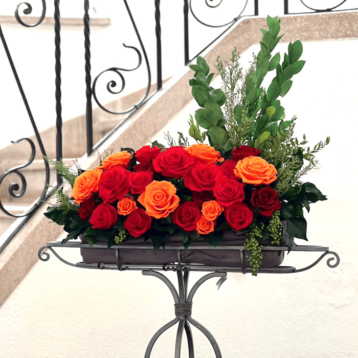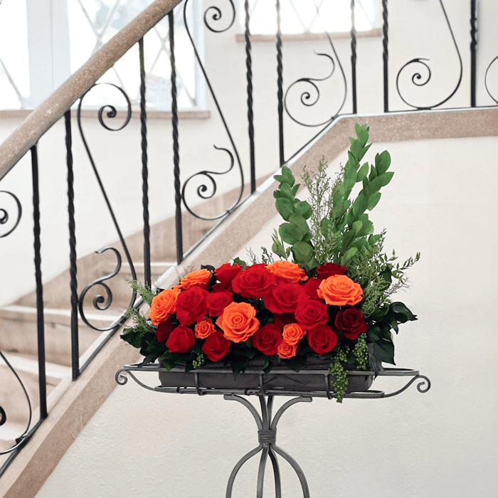 赤とオレンジのバラ、瑞々しいグリーンを組み合わせ、空間との一体感を大切に仕上げました。