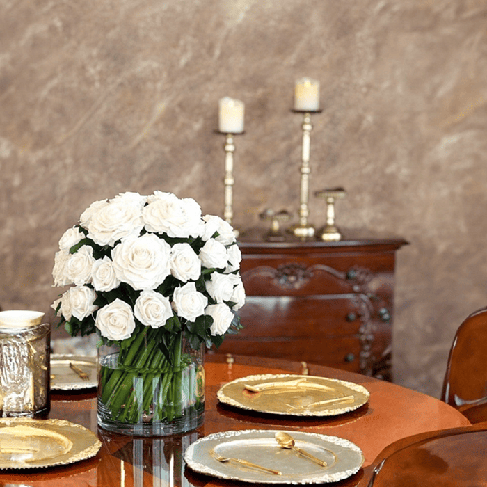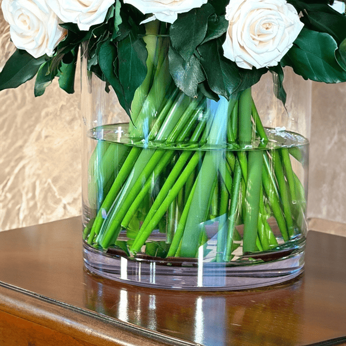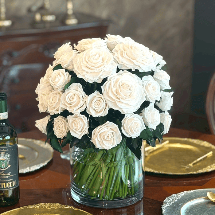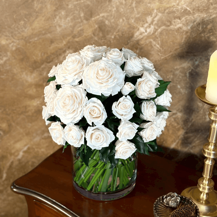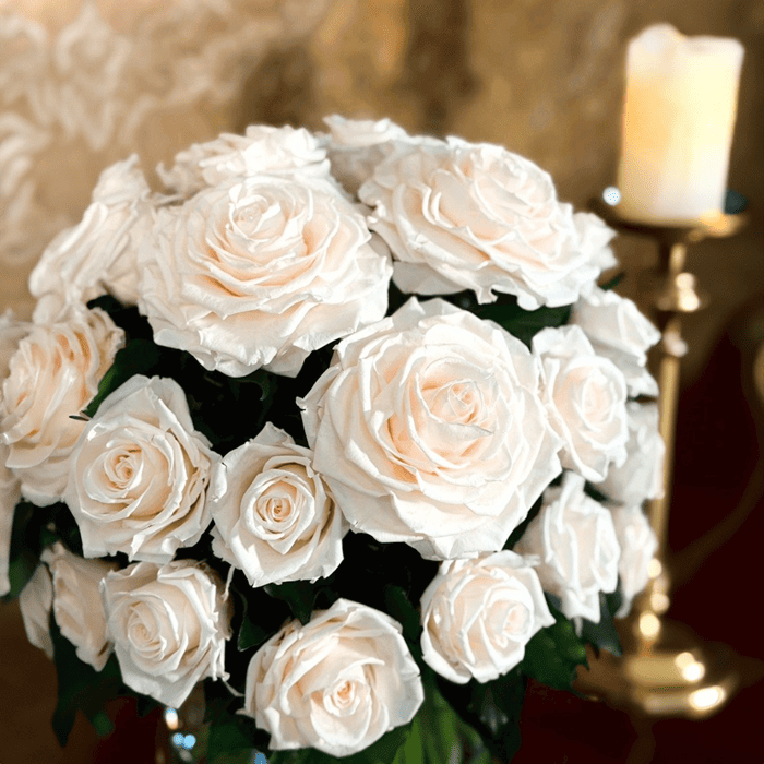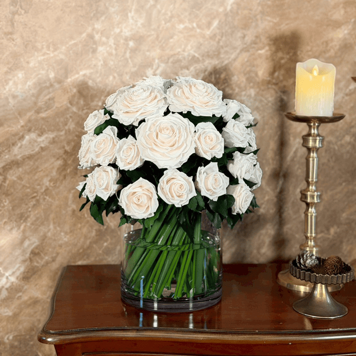 ほんのりピーチを帯びたホワイトローズ約60輪で仕立てたアレンジメントです。